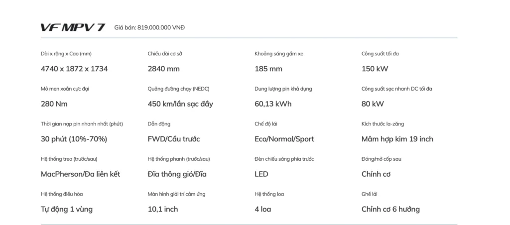 Alt text ảnh: Bảng thông số kỹ thuật chi tiết của xe điện mpv 7.